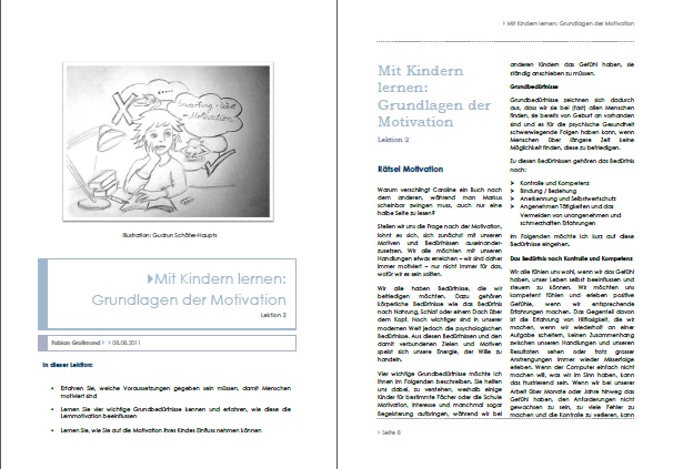 Müssen Sie mit Ihrem Kind erst lange Diskussionen führen, bevor es endlich mit den Hausaufgaben beginnt? Wünschen Sie sich, dass Ihr Kind motivierter und selbständiger lernt? Möchten Sie wissen, welche Lernstrategien für Primarschulkinder besonders hilfreich sind? In unserem kostenlosen Online-Kurs erhalten Sie in 12 Lektionen konkrete Tipps, wie Sie Ihrem Kind mit wenig Unterstützung eine grosse Hilfe sein können. Der Kurs wurde an der Universität Fribourg mit über 600 Eltern auf seine Wirksamkeit hin untersucht - mit schönen Resultaten.